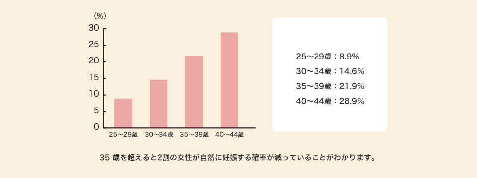 14歳で初潮を迎え、20代のピークから35歳を境に、徐々に妊娠力が低下し、49歳で閉経し子を産めなくなるとされています。